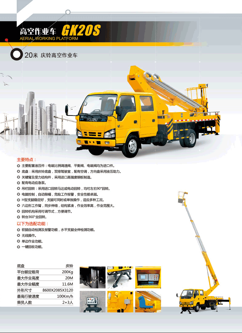 五十鈴高空作業車作業高度為18米,液壓360度全回轉,三節折疊臂,單液壓舉升缸,帶雙向平衡閥,電控操作舉升臂,四支液壓油缸可調式支腿帶雙向液壓鎖(支腿操作為手動操作,可單獨控制),帶1噸吊鉤.帶應急動力單元。最大作業幅度約7米,最大起吊高度8米。