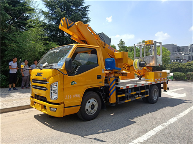 16米江鈴升降高空作業車整車說明: 江鈴16米高空作業車配置參數:江鈴順達新款雙排駕駛室,軸距3360mm,配備五十鈴116馬力正宗國五發動機,5檔變速箱,江齒五檔變速箱,7.00R16原廠鋼絲胎四節六邊形伸縮臂,最大作業幅度9.1m;最大作業高度:16m;最大作業高度時的作業幅度4.4m,360°全回轉。前V后H型支腿,支腿橫向跨距(mm)3605,3670;縱向跨距(mm)3640,3810;吊藍額定載荷≤200㎏。吊藍尺寸:1100x6501150,靜液調平,帶油缸鎖止功能,車架和吊藍雙位操作。帶應急動力單元!