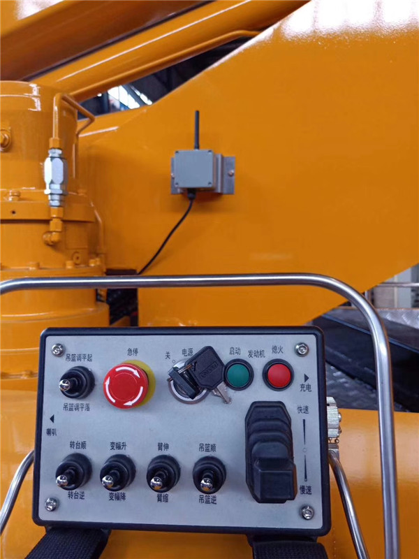 上裝配置:液壓360度全回轉,三節折疊臂,單液壓舉升缸,帶雙向平衡閥,電控操作舉升臂,1噸可伸縮式吊鉤,四支液壓油缸可調式支腿帶雙向液壓鎖(支腿操作為手動操作,可單獨控制)。左右警示燈,黃色車身,全車貼反光標識,雙人穩定作業斗,帶后防護,倆側防護,配一個移動工具箱。