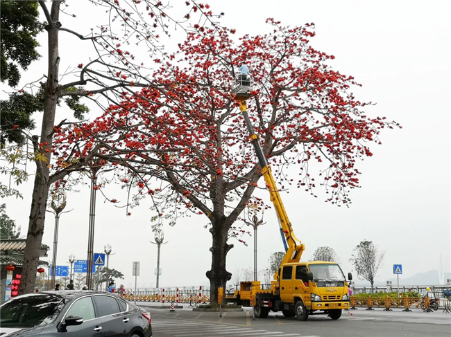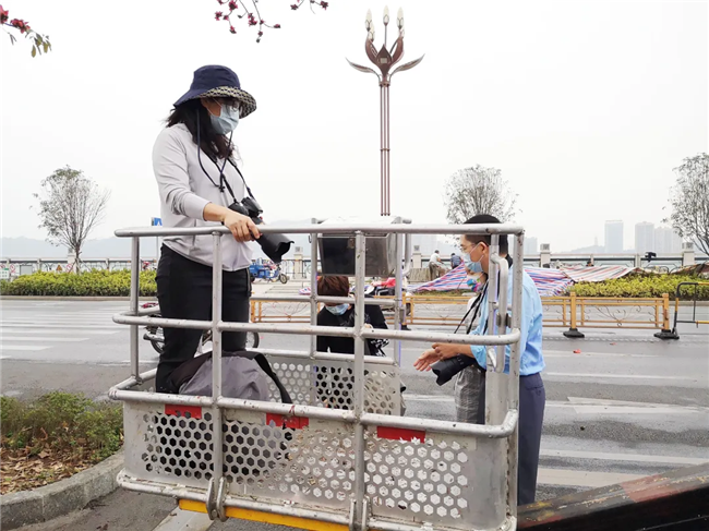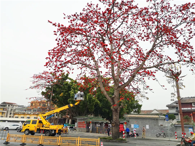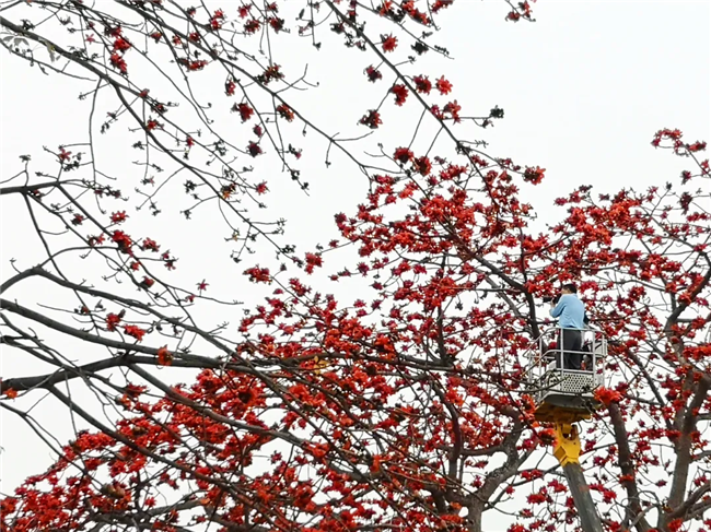 原來,是攝影愛好者為了拍下美美的木棉花,租下了高空作業(yè)車,與閱江樓門前怒放的紅棉來個“近距離接觸”。