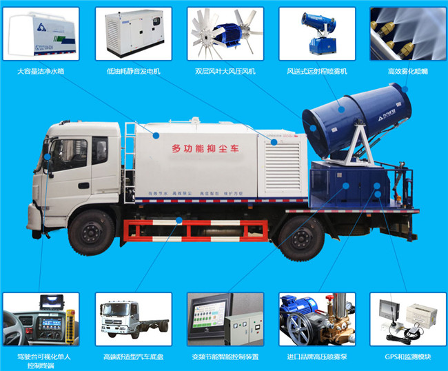 5方抑塵車與5方灑水車的相同之處是共同具有灑水車前沖、后灑、側噴、高射炮、花灑等功能,不同之處在于抑塵車采用方形罐體設計,公告重量不超重,大平臺帶30米霧炮,用抑塵車公告。同時抑塵車在疫情期間可進行噴霧消毒,可輕松實現一車多用。