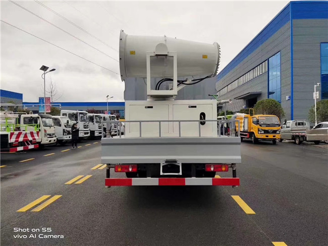 該車帶前沖、后灑、后工作平臺帶高壓水炮(炮可360度旋轉,可連續調節,噴出柱狀、雨狀、半霧狀水流,柱狀射程28米)、帶大功率環保除塵風送式噴霧機(噴霧距離可達40-100米不等,根據客戶要求選擇配備,噴霧機具體性能參數歡迎來電咨詢)。前置電子自動炮,可上下、左右旋轉,駕駛室控制。前置電子炮,方便駕駛員操作,節省人力。