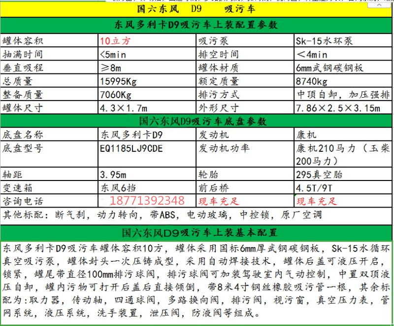 東風(fēng)D9吸污車/國(guó)六10方吸污車:整車配置基本參數(shù)如下