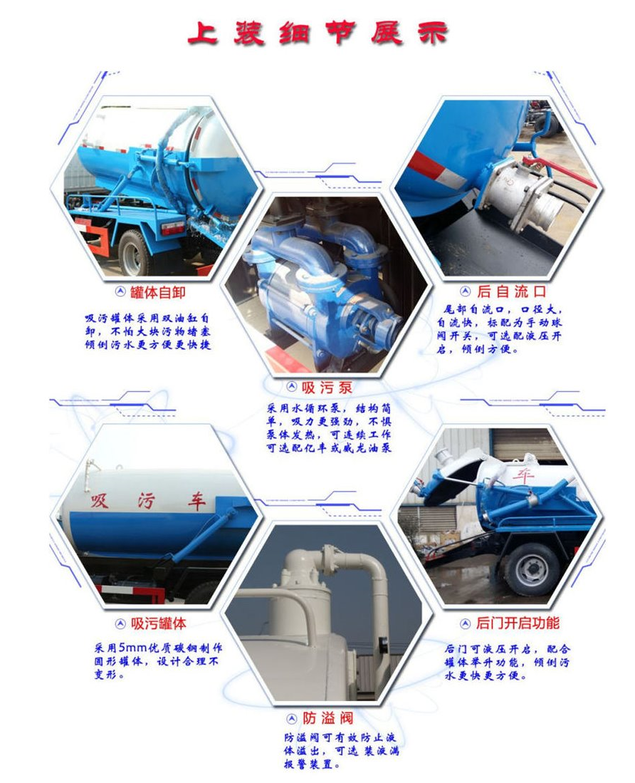 10方東風(fēng)多利卡D9吸污車上裝罐體采用Q235國(guó)標(biāo)6mm優(yōu)質(zhì)碳鋼鋼材制作,配置水循環(huán)泵,泵可自吸自排,真空度高,吸程遠(yuǎn);安裝防溢閥網(wǎng)裝置,預(yù)防抽滿罐了,防溢閥后面的濾網(wǎng)可以再過(guò)濾一次,相當(dāng)于起到二次保護(hù);一個(gè)防溢閥,加粗型視糞亮管,罐體可液壓舉升自卸,后蓋可液壓打開,一個(gè)自流口,一根8米的吸污管。